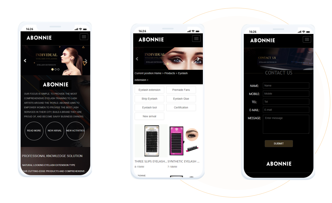 客户至上 质量第一是Abonnie的信念,Abonnie不仅生产睫毛扩展,还生产相关的美容化妆工具。强比设计师以时尚的格调、全球化的视野以及对美容化妆行业的热情,为彰显时尚年轻态度,为客户定制专属的假发睫毛贸易类网站风格。